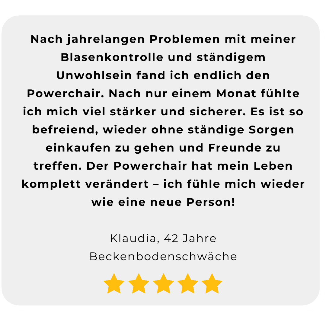 Doch es gibt Hoffnung! Kein Tragen von unschönen Einlagen mehr, kein stressiges Suchen nach der nächsten Toilette, keine Schmerzen - Dank dem POWERchair.
